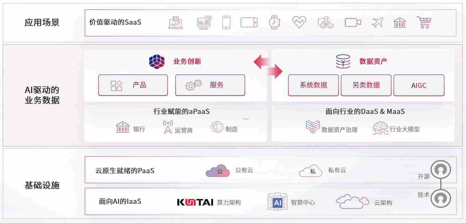 数字时代,,围绕企业数字化转型的关键要素,,,3499拉斯维加斯数码开创性的提出数云融合战略和技术体系框架,,着力在云原生、、、、数字原生、、、、AI原生和信创产业上架构产品和服务能力,,为处在不同数字化转型阶段的快消零售、、、、汽车、、金融、、、、医疗、、、政企、、教育、、、、运营商等行业客户提供泛在的敏捷IT能力和融合的数据驱动能力,,,,构建跨界融合创新的数字业务场景和新业务模式,,,,助力企业级客户建立面向未来的核心能力和竞争优势,,,全面推动社会的数字化、、、智能化转型升级。。。